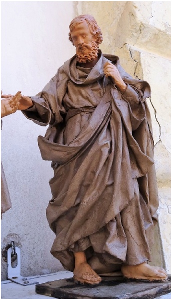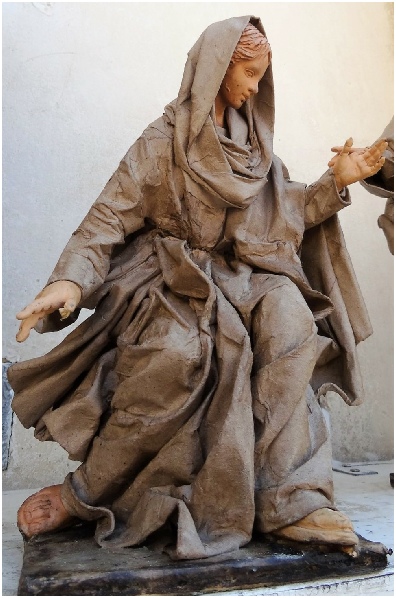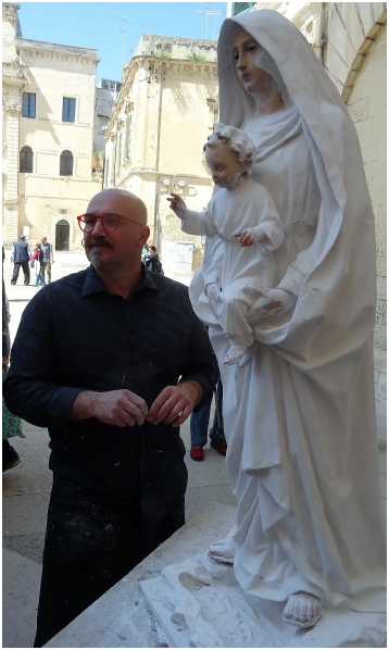 Marco Epicochi bezig met het restaureren van een beeld van papiermache.