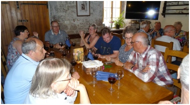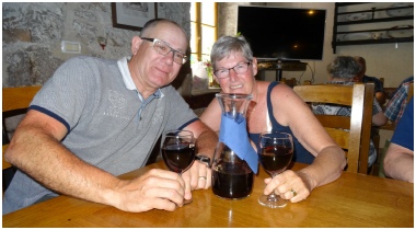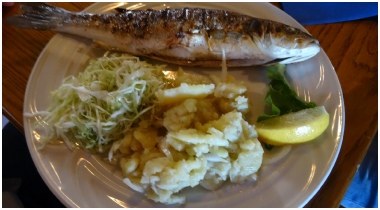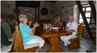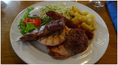 Na dit bezoek brengt onze gids en chauffeur Renee ons naar het restaurant, waar een grote vis ligt te wachten en mixid-grill. Glazen worden gevuld en twee muzikanten Jozef (trekzak) en Thomas (guitaar) - proberen met hun volksmuziek wat sfeer te brengen, wat hun ook prima lukt.