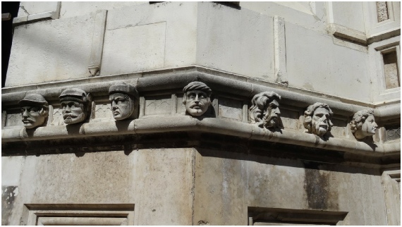 Een klein aantal van de 72 gezichten aan de buitenkant van de Jacobuskathedraal in Sibinek.