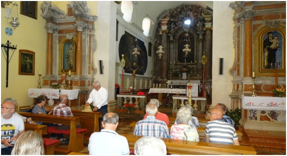 De kapitein, gids, burgemeester neemt ons mee naar zijn kerk. In het Engels vertelt hij zijn levensgeschiedenis.