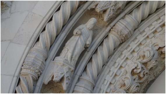 De mooi bewerkte Timpaan van de Jacobuskathedraal.