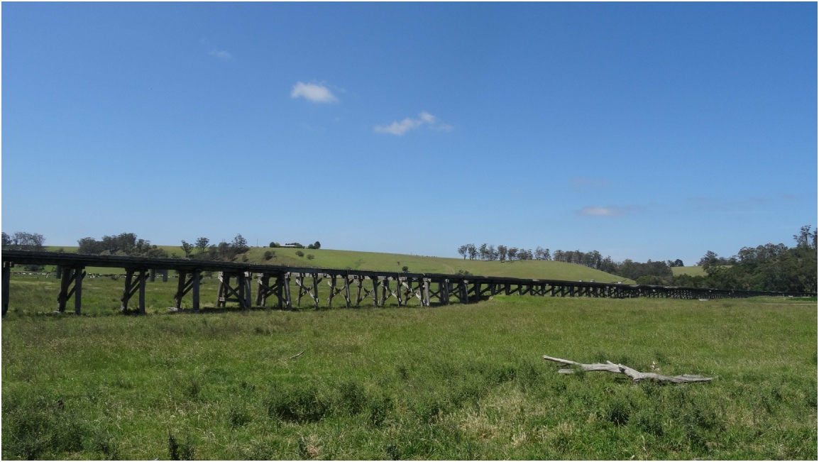 Een uitzonderlijk lange en lage houten spoorwegbrug op de Snowy River-uiterwaarden net ten westen van Orbost, werd gebouwd in 1916 en vormden het oorspronkelijke eindpunt voor de Bairnsdale-Orbost-spoorweg. De brug is 770 meter lang.