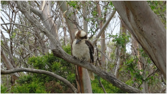 Tijdens onze wandeling door het bos kwamen wij niet alleen Koala’s tegen maar ook de Kookaburra of wel de lachvogel genoemd. Deze is de grootste ijsvogelsoort. De naam lachvogel slaat op de roep van deze vogel die erg op de menselijke lach lijkt.