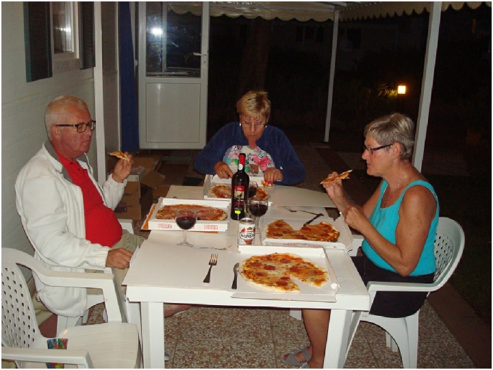 Na al die bezoeken aan kerken smaakte een eenvoudige pizza met een glas wijn, best wel lekker.