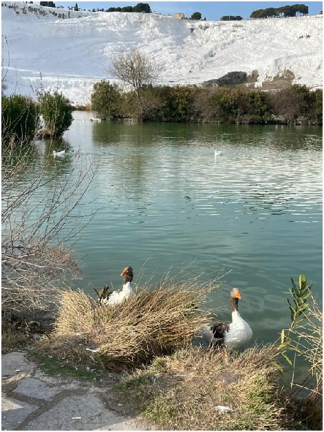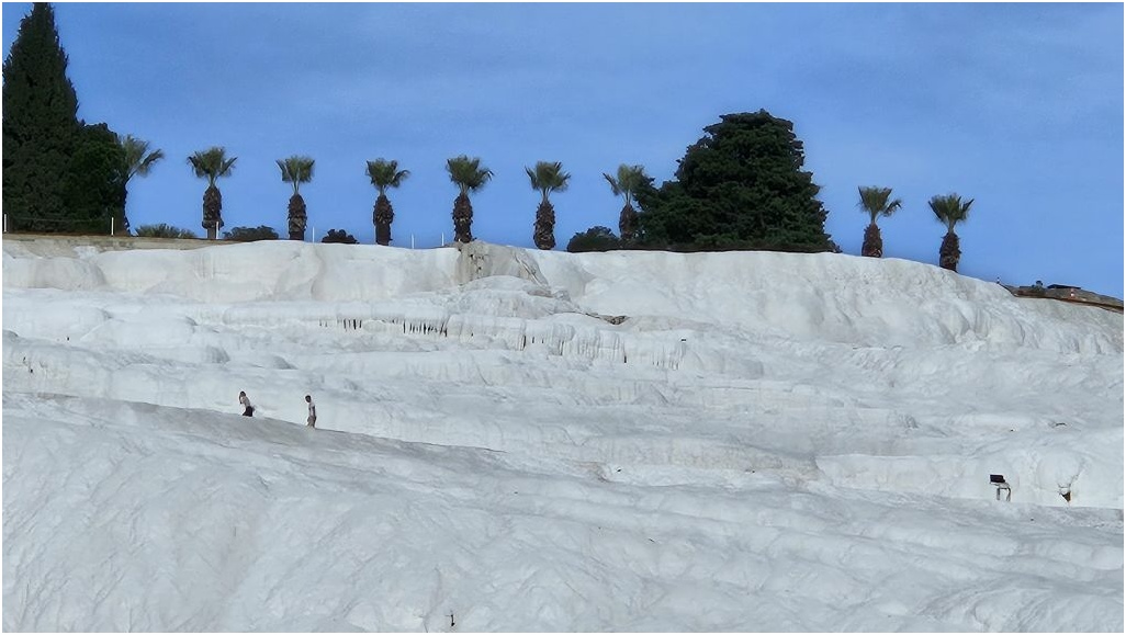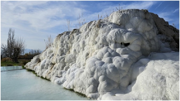 Het kalkrijke water komt via diverse bronnen weer terug naar de oppervlakte wanneer het warmer is dan 35 graden Celsius. Als het weer koeler wordt, dan verdwijnt het koolzuur en blijft er een wit bezinksel over dat een kalkterras vormt. Zo zijn de vele kalkterrassen op Pamukkale ontstaan.